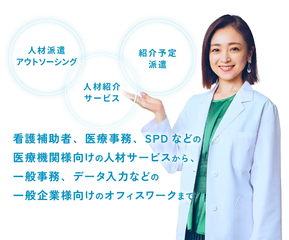 看護補助者を始め、医療機関様向けの人材サービスから一般企業様向けのオフィスワークまで総合人材サービス